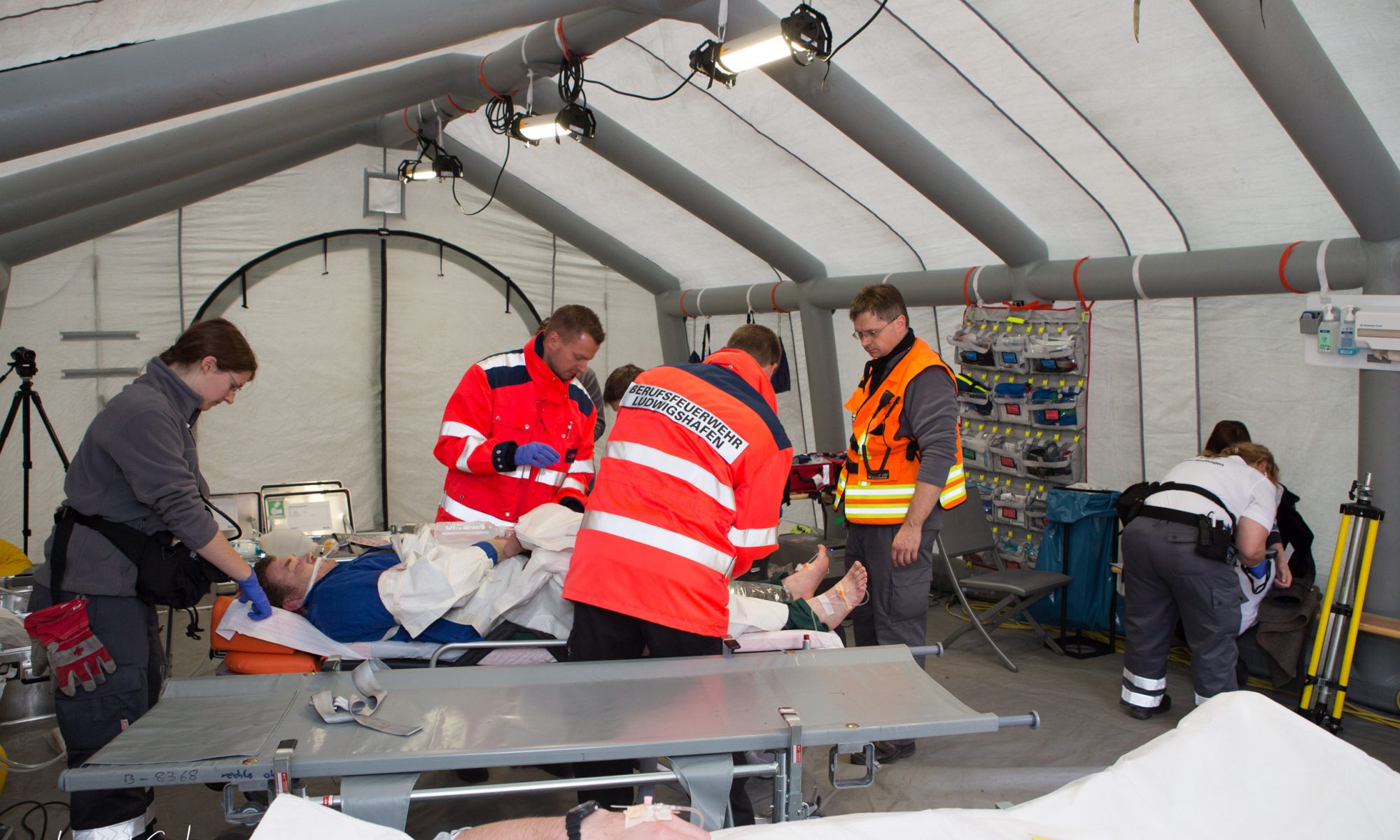 - 2 Behanldungsplätze für maximal gelbe Patienten (liegend) auf Tragen in Bodenlage. Diese Plätze wurden (siehe Bild) vorsätzlich auf die andere Seite gelegt, damit bei der Arbeit an den Tragenlagerungsböcken kein Helfer über die Paitenten fallen kann bzw. den am Boden liegenden Patienten durch die Arbeitshektik entstehenden Vorgänge Angstzustände entstehen.
